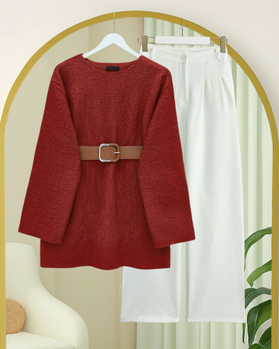 Beli Kemerli Önü Düğmeli Pantolonlu Scuba Takım Bordo