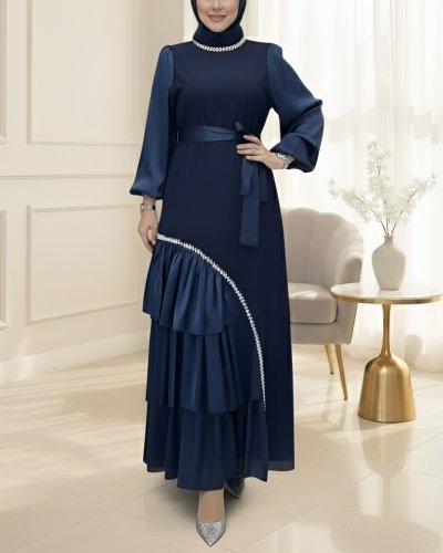 • Yakası Ve Eteği Taşlı Kemerli Saten Detaylı Krep Elbise Laci