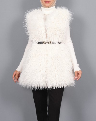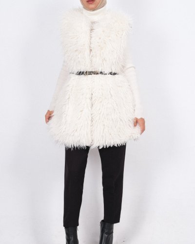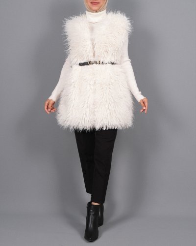 • Kemerli Yan Cepli Kürklü Astarlı Yelek Beyaz