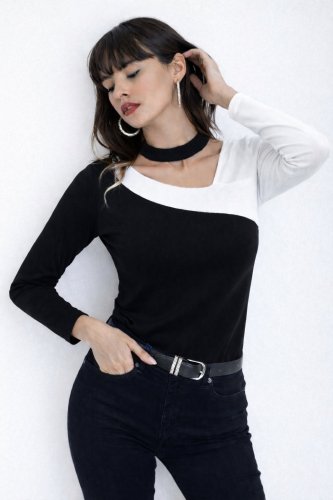 Kadın uzun kollu geometrik yaka detaylı çift renkli viskon bluz