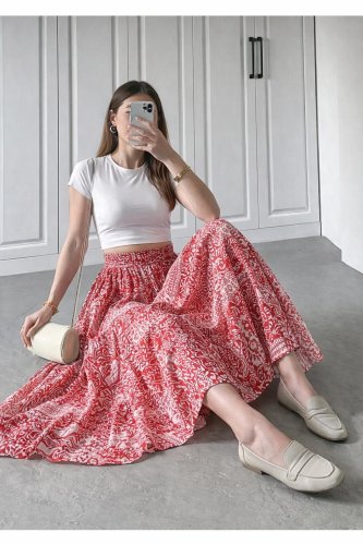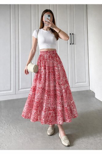 Kadın yüksek bel etnik desen baskılı beli lastikliastarlı etek
