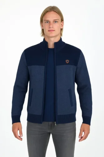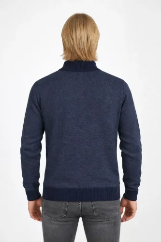 Erkek Fermuarlı Triko Hırka Yüksek Yaka Cepli Günlük Şık Rahat Kalıp Triko Lacivert